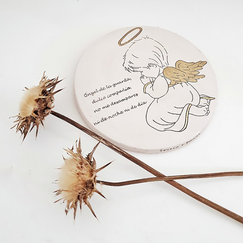 Nuestro ángel de la guarda en relieve con base redonda mide 20cm. de diámetro x 2cm de grosor.